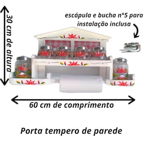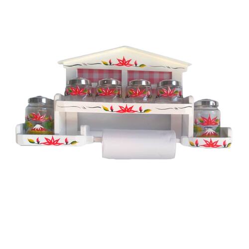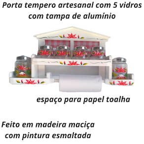 Suporte Para Papel Toalha E Condimentos Com 6 Vidros Lindos porta tempero artesanal com 06 vidros para tempero e espaço para papel toalha Produzido de modo totalmente artesanal decorado a mão Produzido em madeira maciça ( DE LEI ) ecologicamente correta com pintura esmaltada para proporcionar fácil limpeza, os potes para tempero são de vidro, tampa de alumínio com trava. Cabe 1 papel toalha São 4 potes com a capacidade de 220 ml e 2 vidros com a capacidade de 500 ml de capacidade Medidas do suporte: 12 cm de largura 60 cm de comprimento 30 cm de altura