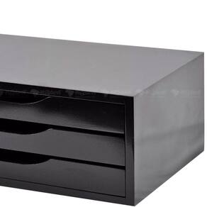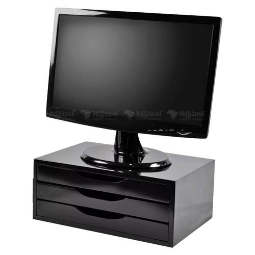com este apoio para o seu monitor você não terá simplesmente um apoio e sim uma parte funcional na sua mesa de trabalho. Evita lesões na coluna e você se sentira menos cansado no final do trabalho. Fabricado dentro dos mais altos padrões de qualidade e funcionalidade. Produzido em madeira de reflorestamento respeitando o meio ambiente. Produto disponível na cor: preto com gavetas pretas, harmonizando o seu ambiente. De alta qualidade. Dimensões:
