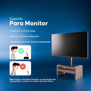 O suporte também auxilia no conforto visual e postura do corpo no dia a dia, ele permite que o monitor fique na altura ideal para seu campo visual evitando o cansaço da visão e estimula a postura adequada ao sentar-se, evitando desconforto na coluna.