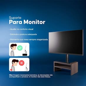 O suporte também auxilia no conforto visual e postura do corpo no dia a dia, ele permite que o monitor fique na altura ideal para seu campo visual evitando o cansaço da visão e estimula a postura adequada ao sentar-se, evitando desconforto na coluna.