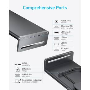 - 10 portas para cada conexão: carregado com uma entrada PD de 100 W, USB-C de 5 Gbps e USB-A para sincronização rápida de dados, duas portas USB-A 2.0 de 480 Mbps, um leitor SD/micro SD, um conector de áudio, conectividade Ethernet e HDMI 4K a 60Hz.