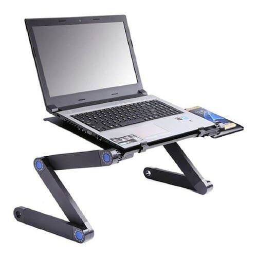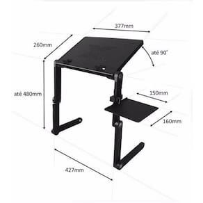 Esta é uma mesa mágica portátil, 360u00b0 dobrável.* Você pode usar na cama, sofá, mesa, tapete, gramado ou até mesmo no seu colo* Ajustável para diferentes alturas e ângulos* Feito de liga de alumínio de qualidade, prático e durável* Equipado com 2 coolers que fornecem o fluxo de ar ideal para dissipar o calor de seu Notebook* Leve, compacto, dobrável e fácil de transportar* Evita dor no pescoço e nas costas ajustando o ângulo para sua necessidadeEspecificações:* Material: Liga de Alumínio* Peso suportado: até 15kg* Comprimento do pé: 260mm* Número de pernas: 6 peças (3*2)* Notebook aplicável: abaixo de 17* Altura do desktop (ajustável): 480mm* Ângulo ajustável do desktop: 360 graus* Área de trabalho (comprimento * largura): padrão 420*260mm* Tamanho de dobramento: padrão 530*260*40mm* Cor: pretoPacote Inclui:1 x mesa portátil dobrável com cooler + placa do mouse