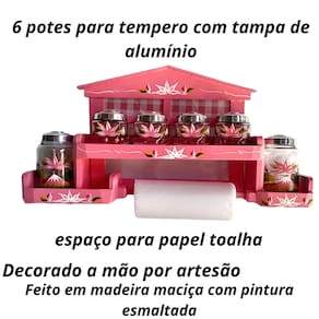 Suporte Para Papel Toalha E Condimentos Com 6 Vidros Lindos porta tempero artesanal com 06 vidros para tempero e espaço para papel toalha Produzido de modo totalmente artesanal decorado a mão Produzido em madeira maciça ( DE LEI ) ecologicamente correta com pintura esmaltada para proporcionar fácil limpeza, os potes para tempero são de vidro, tampa de alumínio com trava. Cabe 1 papel toalha São 4 potes com a capacidade de 220 ml e 2 vidros com a capacidade de 500 ml de capacidade Medidas do suporte: 12 cm de largura 60 cm de comprimento 30 cm de altura