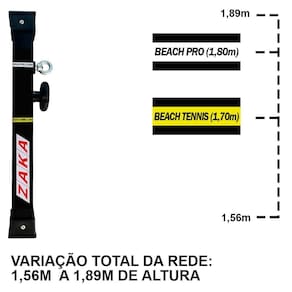 Suporte para Rede com Regulador Mini Beach Tennis, para amantes de Beach, demarcado nas duas modalides usadas categoria amador e profisional, ou adaptado a esportes onde a altura da rede fique entre 1,56 e 1,89 metros, por ser mais compacto/menor é preso e fica fixo na parte de cima da rede, já aparte de baixo tem necessidade de soltar e amarrar a rede na posição desejada,ou seja, solte o manipulo e a rede na parte de baixo e ajuste na altura que desejar, voltando a amarrar a parte que ficou solta. Pode ser fixado em diversos tipos de poste, acompanha parafusos de fixação. Já vai com adesivos demarcando a alturade Beach e Beach Pro.