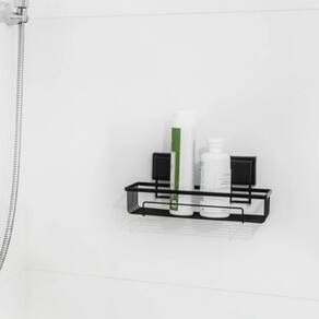 Com acabamento preto fosco e design compacto, este suporte oferece um visual sofisticado e organizado para o banheiro. Ideal para shampoos, condicionadores e outros produtos, mantém tudo ao alcance e evita a desordem no box ou na bancada.