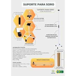 O suporte para soro é indicado para ser em hospitais, em casa e clínicas. - Tripe estável - Base em X desmontável - Aço carbono com pintura eletrostática - Fabricado no Brasil, do fabricante O suporte com pedestal é feito de aço carbono, com 4 quatros ganchos. Tem altura ajustável por mandril de 1,75 a 2,03 m. tubular com 1 metro em 5/8 polegadas e 1 metro 7/8. Ficha técnica: Produto: suporte para soro com rodas Marca: Alo Ortopédicos Composição: estrutura em aço carbono, gancheira e mandril de PP injetado Peso: 2 kg Altura mínima: 1,75 m; Altura máxima: 2,03 m Fabricado no Brasil fornecida pelo fabricante