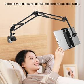 - ?Ajustável e versátil? O suporte de braço do tablet tem braço longo de três estágios e 4 juntas, que é totalmente ajustável e rotativo em 360 graus. Pode ser utilizado em superfícies verticais como cabeceira ou em superfícies horizontais como mesa. Dobre o braço e vire o suporte para a posição de visualização mais confortável, esteja você em pé, sentado ou deitado na cama.