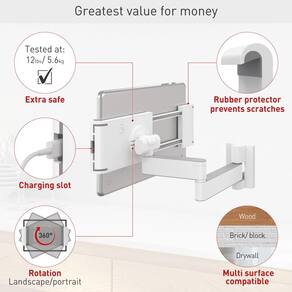 FoscoO Barkan T54 é um suporte de tablet de 4 movimentos com opções de dobra, rotação, suporte giratório e inclinação.O suporte é para tablets de 7 a 12 polegadas. pesando até 1 kg.A distância mínima entre o suporte e a parede é de apenas 3,8 cm e a distância máxima é de 28,4 cm.A fim de oferecer um melhor ponto de visão, o suporte tem três eixos de dobradiça: perto da parede a 180°, dobrável a 360°, placa de tela com conexão giratória a 180°, além de um ferramenta fácil de inclinação de 12 a 90° com um ajuste de ângulo de inclinação contínua.- - Grampo independente - A rotação de 360 graus permite o posicionamento tanto vertical quanto horizontal - -Desde 1988. - Mecanismo de ligação rápida permite conectar e desconectar o tablet facilmente - Perfil fino possibilitado pela distância curta entre a parede e a montagem em posição fechada.