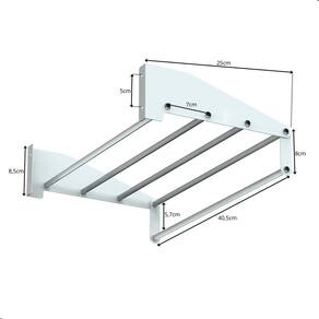 ESPECIFICAÇÕES TÉCNICAS Material das Laterais: Aço inox Material dos Tubos: Alumínio Acabamento: Pintura Eletrostática Epóxi Cor: Branca Dimensões: Altura 8,5 x Largura 40,5 x Profundidade 25 Peso: 590g Fixação: Parafusos e buchas inclusos Uso indicado: Residencial e comercial hotéis, pousadas, etc.