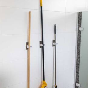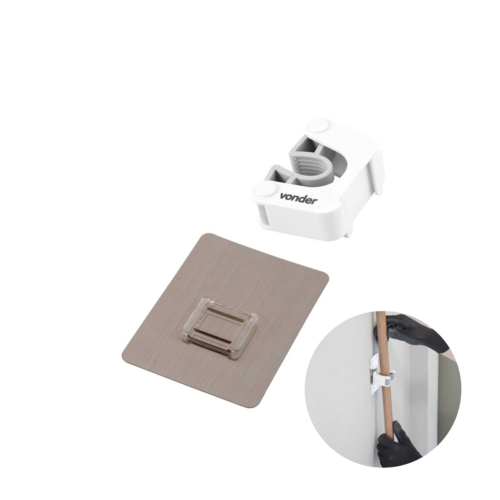 Suporte fácil e prático, com manga emborrachada e adesivo resistente, evitando furos nas superfícies. Ideal para organizar vassouras, rodos e outros utensílios com cabo. Recomendado para superfícies planas e lisas, como cerâmica, vidro, madeira e metal.