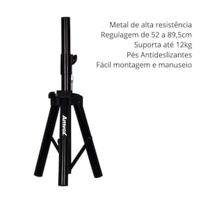 O Tripé ATP 001 da Amvox foi projetado para proporcionar resistência e estabilidade para sua caixa de som. Feito em metal, possui regulagem de altura (52cm fechado, 89,5cm expandido) e suporta até 12kg.