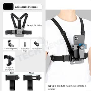 Suporte Peitoral Para E Câmeras Suporte Peitoral Ajustável para e Câmeras de Ação Suporte de peito ideal para capturar vídeos e fotos com , estabilidade e no ângulo perfeito, mantendo as mãos livres. Indicado para diversas atividades como motociclismo, ciclismo, caminhadas, trilhas, esqui, pesca, tiro esportivo e muito mais.