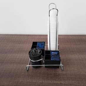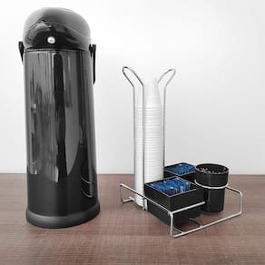 Suporte Porta Copos 50ml 80ml Porta Saches Açúcar Colheres Mexedor Organizador #Bancada Organizada #Copos de 50/80ml #Suporte 4 em 1 Garantia: 90 dias / Peso: 380g / Cor: Cromado, Preto ou Branco / Ref: 1457 Dimensões: 17cm (C) x 17cm (L) x 27,5cm (A). Tamanho do pote quadrado: 7cm (C) x 7cm (L) x 5cm (A). Tamanho pote redondo: 6cm (D) x 7,5cm (A). Espessura do aço: 4mm. Cuidados: Não lavar com materiais abrasivos. Material: - Plástico; - Aço carbono cromado: Com uma camada extra de protetivo aplicado sobre a peça que proporciona cinco vezes mais durabilidade e resistência à corrosão. Este lindo suporte é ideal para ambientes corporativos, pois mantém o espaço organizado e decorado. Acomoda em um só suporte colherinhas, copos, sachês de chás e açúcares. Permite à você pegar todo o conjunto de uma só vez, proporcionando rapidez para passar de uma pessoa para a outra e para a limpeza da mesa ou bancada em que estiver.