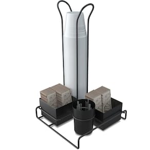 Suporte Porta Copos Descartáveis 50 E 80ml Organizador Porta Sachês Colheres Açúcar Stolf Preto. #Organizador de saches, colheres e copos #Conjunto organizador para café chá #Linha Organização Black Stolf Garantia: 90 dias / Peso: 380g / Cor: Preto Fosco / Ref: 1457BLPSTD Dimensões: 17cm (C) x 17cm (L) x 27,5cm (A) Dimensões do pote redondo: 6cm (D) x 8cm (A) Dimensões dos potes quadrados: 7cm (C) x 7cm (L) x 6cm (A) Espessura do aramado: 4mm Conteúdo: - 01 Suporte aramado para copos descartáveis; - 01 Potinho redondo para colherinhas; - 02 Potinhos quadrados para sachês. Cuidados e limpeza: - Lave com pano levemente umedecido com água, seguido de pano seco; - Não utilizar produtos químicos ou abrasivos na limpeza; - Evitar batidas e o contato com objetos cortantes; - Não vai a lava-louças. Detalhes do produto: - Comporta até 50 copos de 50ml ou 80ml, com diâmetro de até 4,5cm. Materiais: - Polipropileno; - Aço carbono. A pausa para o café tem um parceiro perfeito: o conjunto organizador para chá e café da linha Black Stolf que armazena copos descartáveis, mexedores, sachês e adoçantes. O suporte organizador comporta até cinquenta copos de 50 ou 80ml, com diâmetro de até 4,5cm. Com design aramado o organizador de copos dispõe de acabamento em exclusivo em pintura acetinada na cor preto fosco, garantindo um acabamento moderno, além de maior resistência contra ferrugem.