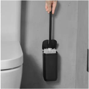 A escova sanitária de piso/parede Ou da Linha Aura é compacta e com tampa, garantindo mais higiene e otimização do espaço. Pode ser instalada no piso ou na parede, liberando espaço e facilitando a limpeza do ambiente. O sistema de abertura da tampa, acionado diretamente pela escova, oferece praticidade no uso diário, enquanto o adesivo transparente cria um efeito flutuante que traz modernidade à decoração.