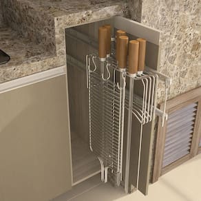 Quem não gosta de curtir o final de semana com os amigos, familiares e um bom churrasco? E para deixar esse momento ainda melhor você pode contar com o suporte para espetos de embutir da Masutti Copat. Para facilitar a organização dos espetos, o suporte possui 3 ganchos removíveis, que dão a possibilidade de pendurar grelhas e outros utensílios para o preparo de churrasco. Prático, proporciona organização de forma inteligente em cozinhas e áreas gourmet. A instalação pode ser feita no interior do móvel, em um módulo específico, ideal para criar o "cantinho do churrasco" ou então sem as corrediças, fixado diretamente na parede ou lateral de algum móvel.