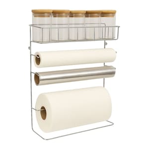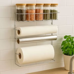 Com design funcional e estrutura resistente, o suporte comporta três tipos de rolos (papel toalha, papel alumínio e plástico filme PVC) e ainda conta com uma prateleira superior para armazenar potes de temperos e condimentos com praticidade. A instalação é simples e o produto acompanha parafusos e buchas para fixação na parede, garantindo firmeza e segurança.