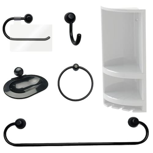 01 suporte de canto para shampoo 01 cabide simples 01 saboneteira 01 papeleira 01 porta toalha argola 01 porta toalha bastão 06 buchas s6 06 parafusos 3 x 37mm
