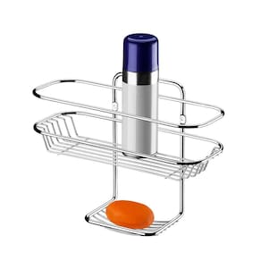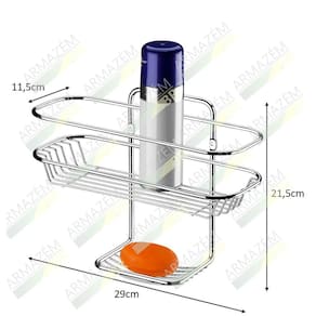 Para ser fixado na parede, o Suporte tem espaço para os frascos de shampoo e condicionador e, abaixo, local especial para o sabonete.