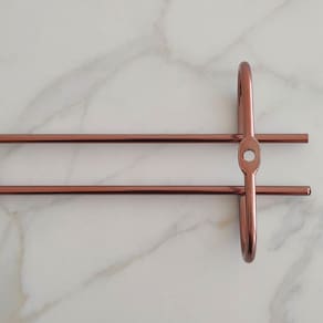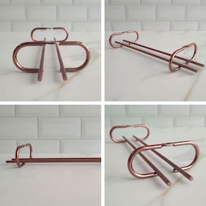 Garantia: 90 Dias / Peso: 128g / Cor: Rose gold / Ref: 83065 Dimensões: 25cm (C) x 9,5cm (L) x 4cm (A) Distância entre os parafusos: 18cm Distância das hastes: 2cm Abertura para base da taça: 8cm Conteúdo: 01 Suporte.