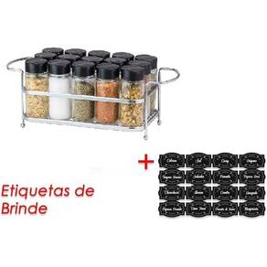 Suporte Porta Tempero Cromado 15 Potes Vidro Tampa Preta O porta temperos de vidro é indispensável em sua cozinha. Com esse suporte aramado você terá os temperos sempre ao alcance, durante o preparo dos alimentos. Possui design inovador com acabamento em alto brilho, além de alças laterais que auxiliar no transporte, por isso pode facilmente ser levado a mesa para complementar as refeições.
