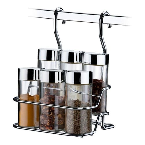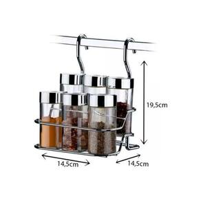Para deixar sua cozinha elegante e com muita praticidade, essa peça é fundamental para a sua cozinha. O conjunto é composto por 1 suporte e 6 vidros e pode ser utilizado em barras tubulares ou de perfil chato. Além do tradicional tratamento superficial da marca - onde são aplicadas até 4 camadas de metal - os produtos são revestidos com uma camada extra do protetivo especial Rust Free, garantindo cores vivas e brilhantes, além de maior resistência contra ferrugem.Características:- Dimensões do Suporte c/ os Porta Temperos: 14,5cm (Largura) x 19,5cm (Altura) x 14,5cm (Profundidade)- Dimensões do Porta Tempero: 4cm (Diâmetro) x 10cm (Altura)- Peso Total: 900g- Conteúdo da embalagem: 1 Suporte aço cromado + 6 Frascos de vidro + 6 Tampas plásticas- Possui Tecnologia Rust Free: Resistente ao ferrugem, aos raios UV e à umidadeAtenção: Barra para pendurar o suporte não inclusa (deve ser adquirida separadamente).