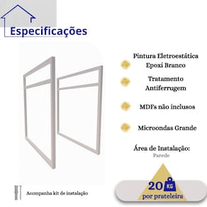 Suporte Prateleira Industrial Forno Microondas 45cm Prof Cor: Branco Suporte Prateleira Industrial 48x48 Nosso Produto: Eleve a Organização e Estilo da sua Cozinha Transforme sua cozinha com o Suporte Prateleira Industrial para Forno e Microondas de 45cm. Projetado para oferecer funcionalidade e estética, este suporte é perfeito para otimizar o espaço e garantir um ambiente mais organizado e moderno. Características do Produto: Dimensões: 45cm de largura, ideal para fornos elétricos e micro-ondas. Material Resistente: Fabricado em aço de alta qualidade com pintura epóxi, proporcionando durabilidade e proteção contra ferrugem, impactos e riscos. Design Industrial: Acabamento preto fosco que combina perfeitamente com diversos estilos de decoração, conferindo um toque sofisticado e contemporâneo à sua cozinha. Suporte Robusto: Capacidade de carga robusta, ideal para eletrodomésticos pesados, garantindo segurança e estabilidade. Vantagens e Utilização: Otimização do Espaço: Libere espaço nas bancadas e mantenha sua cozinha mais organizada. Ideal para cozinhas pequenas ou áreas gourmet. Versatilidade: Pode ser instalado tanto na parede quanto no teto, adaptando-se às suas necessidades e preferências. Facilidade de Instalação: Acompanha kit de instalação com parafusos e buchas, garantindo uma montagem rápida e simples. Organização Funcional: Perfeito para armazenar e organizar não apenas o forno elétrico ou micro-ondas, mas também utensílios domésticos, paneleiros e outros itens de cozinha. Por Que Escolher Nosso Suporte Prateleira Industrial Escolha nosso Suporte Prateleira Industrial para Forno e Microondas de 45cm e transforme a funcionalidade e o design da sua cozinha. Combinando durabilidade, estilo e praticidade, é a solução ideal para quem busca otimizar o espaço com elegância e eficiência. Garanta já o seu e leve a organização da sua cozinha a um novo nível OBS: MDFs não inclusos Especificações Técnicas Suporte Resistencia: até 40 kg Dimensão Prateleira: 48cm x 48cm Distância entre prateleiras: 36cm Profundidade para Madeira: 45cm Composição da embalagem 1x Suportes Kit Parafusos e buchas para fixação na parede do vendedor: 90 dias
