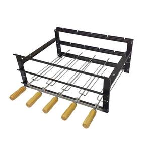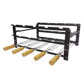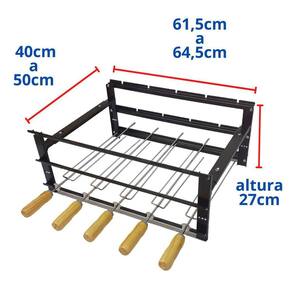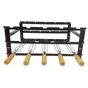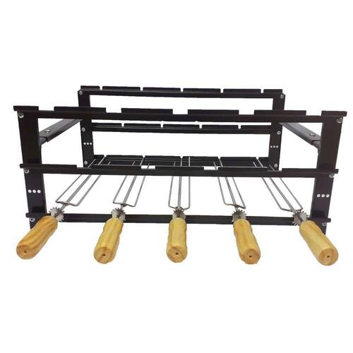 O Suporte Kit Preto - 5 Esp, extremamente prático e resistente, ele é o equipamento ideal para o preparo de carnes, frango, cortes grandes como costela e até mesmo vegetaisCom estrutura toda em Aço Carbono, tem capacidade para acomodar 5 espetos.É ideal para garantir a qualidade do seu churrascoTodos os espetos possuem cabos de madeira natural, não superaquecem para maior conforto e segurança no preparo de seu churrasco.Com 5 espetos é possível realizar um churrasco para até 15 Pessoas. dimensões:altura: 27 cmProfundidade: 40 a 50 cmLargura: 61,5 a 64,5Peso: 4,450 kg