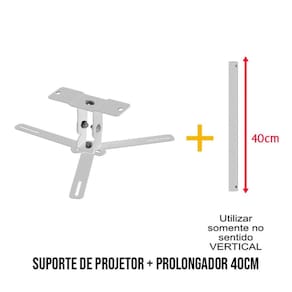 Dados do produto: - sustentação de projetor com fixação em parede ou teto - para todos os tipos de projetores, inclusive mini projetor de led com 1 furo - braço extensor de 40 cm incluso - giro de 360 - inclinação de até 90 - garantia: 1 ano - carga máxima: 3 k - distâncias do teto:7 ou 48 cm