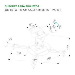 O Suporte projetor de teto da PIX é a solução ideal para quem busca praticidade e eficiência na instalação de projetores. Compatível com projetores que possuem 3 ou 4 pontos de fixação, ele se adapta a diversos modelos e marcas, sendo perfeito para qualquer ambiente. Especificações Técnicas: - Modelo: PX-13T - Capacidade para até 20Kg - Rotação 360 - Inclinação 90 - Padrão VESA: 75x75 - 400x400 - Comprimento: 13cm - Composição: Aço carbono - Ajuste fácil de ângulos de visualização - 3 ou 4 pontos de fixação, compatível com a maioria dos projetores - Praticidade na montagem e instalação - Acompanha kit para instalação - : 5 anos