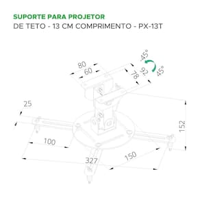 O Suporte projetor de teto da PIX é a solução ideal para quem busca praticidade e eficiência na instalação de projetores. Compatível com projetores que possuem 3 ou 4 pontos de fixação, ele se adapta a diversos modelos e marcas, sendo perfeito para qualquer ambiente. Especificações Técnicas: - Modelo: PX-13T - Capacidade para até 20Kg - Rotação 360 - Inclinação 90 - Padrão VESA: 75x75 - 400x400 - Comprimento: 13cm - Composição: Aço carbono - Ajuste fácil de ângulos de visualização - 3 ou 4 pontos de fixação, compatível com a maioria dos projetores - Praticidade na montagem e instalação - Acompanha kit para instalação - : 5 anos