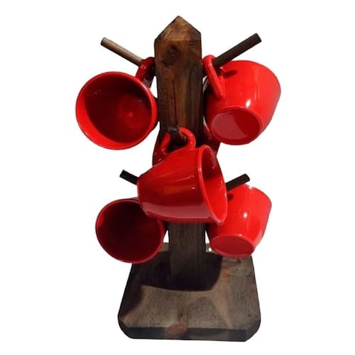 Suporte rústico com 6 xicaras de café acrílico cristal - vermelha Suporte organizador em madeira rústica com 6 xicaras de café / chá em acrílico cristal décor