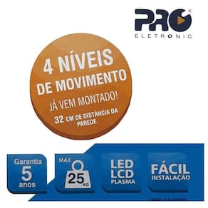 Leve, compacto e super resistente, o suporte PQST-1355/02 possui 4 níveis de movimento, proporcionando várias combinações diferentes para o melhor posicionamento de sua TV. Já vem montado, facilitando ainda mais a instalação. Acompanha passa-cabo, para um excelente acabamento.