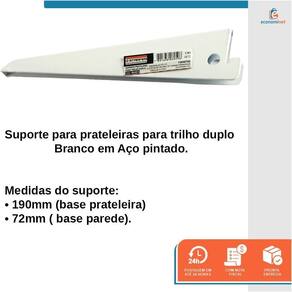 O Suporte para Trilho é ideal para fixar prateleiras com largura até 170mm. Com encaixe duplo, pode ser utilizado com trilhos de rasgo duplo. Seu design com acabamento em pintura epóxi garante maior resistência e durabilidade.