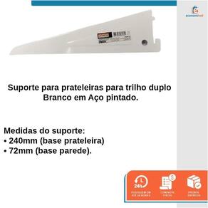 CARACTERÍSTICAS TÉCNICAS: Material: Aço pintado Medidas: 240mm base prateleira x 72mm base parede Espessura da chapa: 2mm Peso suportado: 60kg Distância entre os encaixes horizontalmente : 1cm Marca: Starfer Ref.: 13040710 Ean: 7891638060602