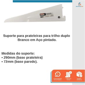 CARACTERÍSTICAS TÉCNICAS: Material: Aço pintado Medidas: 290mm base prateleira x 72mm base parede Espessura da chapa: 2mm Peso suportado: 60kg Distância entre os encaixes horizontalmente : 1cm Marca: Starfer Ref.: 13040729 Ean: 7891638998486