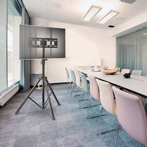 O tripé para TV da Central Suportes proporciona melhor aproveitamento do espaço e é perfeito para ambientes corporativos, eventos e feiras.