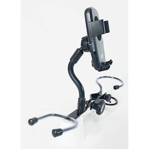 Suporte triplo de celular, líquidos e cavaco/banjo, fabricado em metal de alta resistência e pintura epóxi, compacto medindo somente 34x10x10 cm e pesando 340g e de fácil instalação, facilita e deixa bem a mão em segurança o seu instrumento, seu copo para hidratação e suporte para colocar seu celular, fazer suas transmissões ao vivo ou acompanhar seu repertório, é acoplado em pedestais de microfone padrão, acompanha manual de utilização.