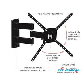 Suporte articulável e giratório telesinal 3065 Atenção: Se você deseja um outro modelo deste suporte que articule mais, ou ainda que fique mais próximo ou mais distânte da parede, nesta mesma página você verá uma vasta opção onde poderá escolher o que atende melhor as suas expectativas. Este modelo permite até 6 tipos de movimentos diferentes, inclina até 16 para cima ou para baixo e articula até 180º na horizontal, para ambos os lados. Obs: o grau máximo de articulação vai depender do tamanho do seu televisor, quanto maior menor será o movimento pois em algum momento a lateral do seu aparelho irá encostar na parede limitando esta movimentação. Praticamente todos os suportes articulados deste formato foram projetados para serem fixados em paredes de alvenaria, isso não impede de fixá-lo em painéis de madeira ou até mesmo em bases de metal porém será necessário adquirir parafusos apropriados para isso que não acompanha o produto. Se resolver utlizar desta forma verifique primeiro se o painel de madeira resistirá ao peso de todo o conjunto. Sugerimos por segurança não utilizar parafusos auto atarrachantes, mas sim parafusos que ultrapassem a madeira de um lado a outro, fixando por trás com porcas travantes ou porcas normais acompanhadas de arruelas . Dependendo do peso do seu aparelho o suporte poderá ficar levemente inclinado para baixo sem que isso implique em problemas de sustentação. Acompanha parafusos para a maioria dos aparelhos no padrão vesa de instalação porém pode haver televisores específicos onde seja necessário adiquirir parafusos mais longos não contemplados aqui. Se não souber instalar procure um profissional qualificado evitando desta forma colocar em risco a sua segurança e a das pessoas que circularão pelo ambiente. Desenvolvido para ser utilizado em aparelhos no padrão vesa de instalação, de led / lcd / plasma / 3d / 4k e ou smart tv, de 10 a 65 polegadas, com furação traseira de 100x100 até 400x400mm. Distância da parede: mínimo 70, máximo 200mm. Produzido em aço de alta qualidade, com acabamento em pintura eletrostática epóxi . Suporta aparelhos com até 45 kgs. Fácil de instalar. 5 anos de . Já vem pré montado. Marca: Não Informado