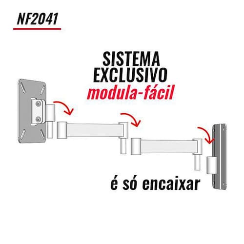 Suporte Tv Até 48 Nf2041 Tri-Articulado MultiformaSuporte inclinável para todos os tipos de telas old, 4k,3d, led, lcd ou plasma de 10" à 48", com 4 movimentos laterais e inclinação frontal de 0º ou 15º.Compatibilidade: tv's led, ldc, plasma, 3d, 4k, oled e smart tv de 10" à 48"Material: aço carbono e pintura eletrostática com aplicação de fosfato maior durabilidade Cor: Preto;Garantia: 5 anos, conforme normas do fabricante;Fabricante: multiforma;Carga máxima: 30 kilos;Dimensões do produto montado:Distância da parede: 6 cm à 37 cmArticulado: sim, 4 movimentos de até 180º;Inclinação: frontal de 0º ou 15º;Furação: vesa=mm : 75 x 75; 100 x 100; 200 x 100 ou 200 x 200Itens inclusos: 1 - suporte montado; 2 - braço extensor; 1 - conjunto de parafusos; manual com instruções de montagem e garantia impressos na embalagem;Parafusos inclusos para fixação da tv no suporte: m4x16; m6x20 e m8x25, medidas diferentes devem ser adquiridas separadamente.