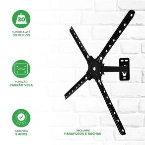 - Compatível com TVs e monitores de 10 a 60 - Capacidade de carga: até 30kg - Material: Aço carbono de alta durabilidade - Ajustes: Inclinação de 15, rotação de 360 e articulação de 130 - Distância da parede: Mínima de 6,3cm e máxima de 24cm - Compatível com padrão VESA: 50x50 até 400x400