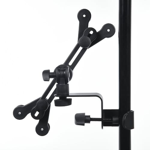 Suporte Universal Reforçado Para Tablet Pedestal De Microfone -4 pontos de silicone para apoio. -pode ser na ponta de pedestais que tenham rosca 5/8 suportes de microfone no lugar do . -clamp compatível com qualquer pedestal para microfone. -sistema de trava rápida,coloque ou tire o seu tablet do suporte sem perder tempo. -leve,prático,resistente e seguro. -não deixa riscos,marcas ou danifica o seu pedestal e tablet. -dois conjuntos de extensões de braço em V estão incluídos para acomodar tablets de 7 a 14 . Os braços em V são ajustáveis para acomodar com segurança o seu tablet. -dimensões Regulagem diagonal:6,1-11,2 15,5 cm-28,5 cm Fixação em tubos de até 35 mm de diâmetro. -180 de inclinação. -360 de rotação. -suporta os modos retrato e paisagem e oferece ângulos de visualização ideais, quer esteja sentado ou em pé. -material: ABS,aço -peso:567 g -capacidade de peso:3 kg -cor: preto -ideal para substituir pastas com inúmeras partituras ou uso como teleprompter. Obs: Não acompanha estante de microfone Marca: Não Informado