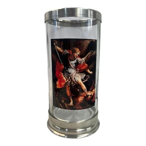 O Suporte de Vela São Miguel Arcanjo é feito de alumínio e vidro, sendo ideal para uma vela de 7 dias. Por ser um castiçal com material antichamas, você tem maior segurança ao acender suas velas.