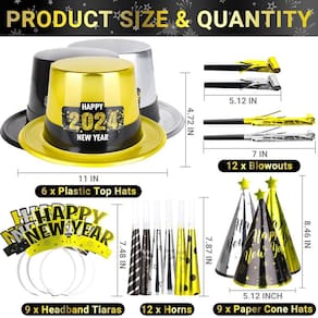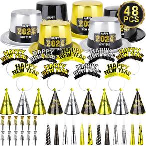 - O pacote inclui - Crie uma atmosfera festiva e empolgante para sua festa de Ano Novo com nossos 48 suprimentos de festa de Ano Novo para 24 convidados, incluindo 6 cartolas de plástico, 9 chapéus de cone (é necessário montar), 9 tiaras de feliz ano novo, 12 buzinas de festa, 6 sopradores dourados e 6 sopradores prateados.