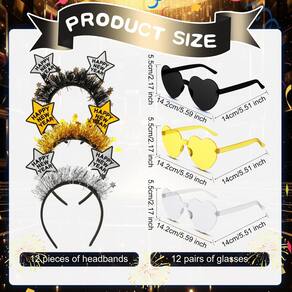 - Conteúdo do pacote: cada pacote inclui um total de 24 itens, com 12 óculos de sol de coração e 12 bandanas de Feliz Ano Novo; isso significa que você recebe muitas guloseimas para distribuir aos seus convidados ou amigos, melhorando o clima festivo; os óculos de sol vêm em 3 cores: preto, amarelo e branco, enquanto as bandanas são em preto, dourado e prata