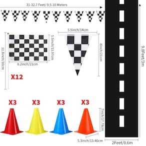 Características: Reutilizável e prático: Estes suprimentos de festa de corrida de carros podem ser aplicados muitas vezes. A pista de corrida pode ser dobrada perfeitamente para o próximo uso, fácil de transportar e armazenar. Os banners pendentes em preto e branco clássicos são decorações requintadas em várias ocasiões, como festas de aniversário, proporcionando a você uma boa experiência de uso. Acabamento fino: Estes tapetes de corrida de pista de corrida, cones de trânsito e bandeiras de corrida quadriculadas podem ser expostos ao vento e à chuva, adequados para uso interno e externo. Especificações: Itens: mini cones de trânsito Material: plástico Cor: como mostrado na imagem. Tamanho: aprox. 17 cm. Itens: bandeiras quadriculadas com palitos Material: tecido de poliéster com alça de plástico Cor principal: preto e branco Tamanho: cerca de 21 x 14 cm/8,27 x 5,51 polegadas Itens: bandeira quadriculada de corrida Material: tecido de poliéster Cor: preto e branco Tamanho: cerca de 9,5-10 metros/31,17-32,81 pés Itens: tapete de corrida para pista de corrida Material: tecido não tecido Cor: preto e branco Tamanho: cerca de 3 x 0,6 metros/9,8 x 2 pés Quantidade: 26 peças A embalagem inclui: 12 cones de tráfego de plástico. 12 bandeiras quadriculadas com palitos 1 bandeira quadriculada de corrida 1 tapete de corrida para pista de corrida. Observação: Medição manual, permita pequenos erros no tamanho. A cor pode existir uma pequena diferença devido a diferentes exibições de tela. Pode haver risco de enrolamento e cutucada, mantenha longe de pessoas pequenas. Os itens são adequados para pessoas acima de 12 anos de idade. - Itens enviados para você: há um total de 26 peças de suprimentos de festa de aniversário de carro de corrida no pacote para você, incluindo 12 peças de cones esportivos, 12 peças de bandeiras quadriculadas com varas, 1 peça de bandeira quadriculada de corrida e 1 peça de tapete de corrida de piso de pista; uma boa combinação pode trazer muita diversão para seus eventos esportivos e festivais - Informações de tamanho: estas decorações de festa de carro de corrida têm tamanhos moderados para você, cada cone de futebol mede aprox. 17 cm, as bandeiras de corrida têm cerca de 21 x 14 cm. O comprimento da bandeira quadriculada é de cerca de 9,5 a 10 metros. Além disso, o tapete de corrida preto é de cerca de 3 x 0,6 metros - Material útil: os mini cones de tráfego são feitos de plástico, as bandeiras de festa são feitas de tecido de poliéster com alça de plástico e o banner da pista de corrida é feito principalmente de tecido de poliéster, o corredor de piso da pista é feito de tecido não tecido; esses materiais confiáveis com cores brilhantes são muito adequados para festas temáticas de corrida - Uso extensivo: estas bandeiras quadriculadas de corrida e suprimentos de festa de corrida estão cheios de elementos esportivos, que podem ser aplicados em várias ocasiões, como festas de corrida, festas de aniversário, eventos esportivos, festas temáticas de corrida e muito mais - Bom complemento para uma festa de corrida: estes cones de trânsito, tapetes de pista de corrida e bandeiras quadriculadas podem servir decorações delicadas para suas festas; use o corredor de chão preto para decoração simples de mesa; e o banner da bandeira de corrida pode funcionar como uma linha de chegada para sua pequena corrida de velocidade, ou pendurá-los em árvores, mesas, paredes, cercas, varandas, portas, vigas e assim por diante para decorações