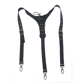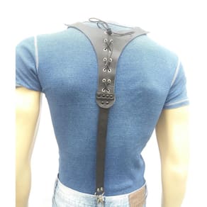 Suspensório de couro ajustável através de fivelas de rolete. A regulagem de tamanho e feita por ilhoses. As tiras são presas em uma estrutura com detalhes em amarrações trançadas. Este detalhe é o grande diferencial do produto tornando-o um produto super exclusivo. As tiras que possuem os ilhoes para regulagens têm 42 cm de comprimento, possibilitando inúmeras opções de ajuste de tamanho. As tiras que sustentam os mosquetões que prendem nos passantes da calça têm 28 cm, sendo duas na frente e uma atrás. Este produto é indicado para ser com calça jeans. Especificações: Cor: Preto Ocasião: Casual Materiais: couro bovino 100% Fivelas: ferro Rebites e ilhoses: ferro Mosquetões: zamak Medidas: Tiras com cerca de 25 mm de largura 1,20m de comprimento máximo, ajustável a partir de 0,98m Fivelas: 25 mm Cuidados: Por se tratar de couro o produto não pode ser lavado. A limpeza deve ser feita com pano umedecido em sabão neutro ou vinagre. Também pode ser óleo hidratante para manter o brilho e maciez. : Efetuamos a troca em 7 dias no caso de defeito de fabricação. Produto com a qualidade do ateliê Blood Art Marca: Não Informado