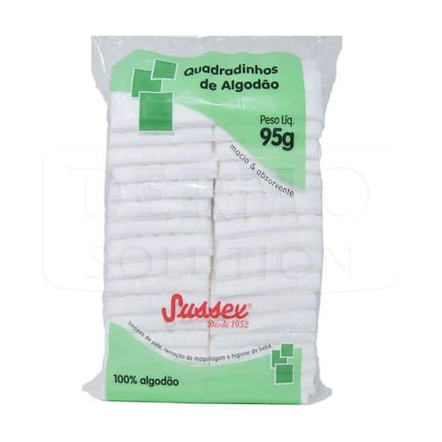 Sussex Algodão Quadradinho 95g DESCRIÇÃO: Os Algodões Sussex são indicadas para a limpeza e assepsia da pele, desde as normais até as mais sensíveis como de bebês.AÇÃO/ATIVOS: Composto de fibras 100% algodão, purificadas e alvejadas. Facilita a higienização e assepsia da pele, remoção de maquilagem, esmalte, higiene do bebê, etc.MODO DE USAR: Aplicar no algodão o produto a ser utilizado e espalhar sobre a pele.ESTE ANÚNCIO CONTÉM: 01 Sussex Algodão Quadradinho 95gSussex AlgodÃo Quadradinho 95g