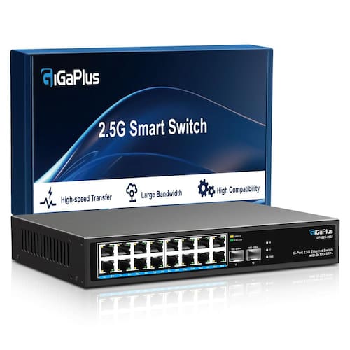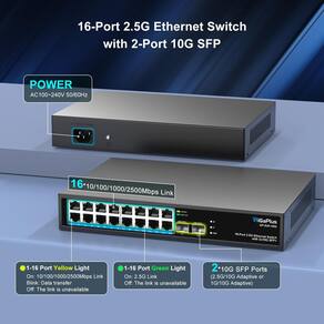 - Vitesse réseau ultra rápido 16 x 2,5 G: le commutateur réseau comprend 16 portas Ethernet RJ45 100/1000/2500 Mbps, 2 portas SFP de liaison montante 10 G, les ports 1 à 16 sont conformes à la norme IEEE802. 3bz (2) .5 G), prennent en charge l'auto-adaptation 10/100/1000M/2.5G et une capacité de commutation de 120Gbit/s pour répondre aux besoins des réseaux à haut débit.