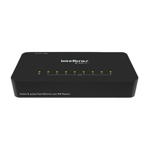 O Switch SF 800 Q+ possui 8 portas Fast Ethernet 10/100 Mbps para compartilhamento de internet com os dispositivos conectados. O Switch possui a função QoS para priorização do tráfego de dados, voz e vídeo e sua porta LAN 1 possui suporte a PoE Passivo para alimentação do switch através do cabo de rede.